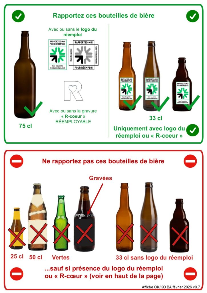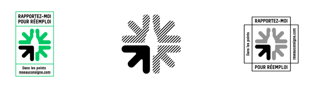 - Nouveau : toutes les bouteilles réemployables : limonade, kombucha, kéfir, jus de fruits, vin … si le logo du réemploi est sur la bouteille ou son étiquette (ci-dessous les exemples standards). Dans ce cas, laissez l’étiquette sur la bouteilles pour que nous vérifions l’aptitude au réemploi !