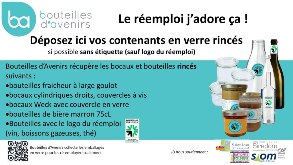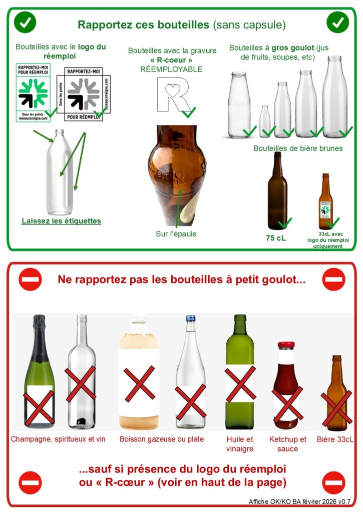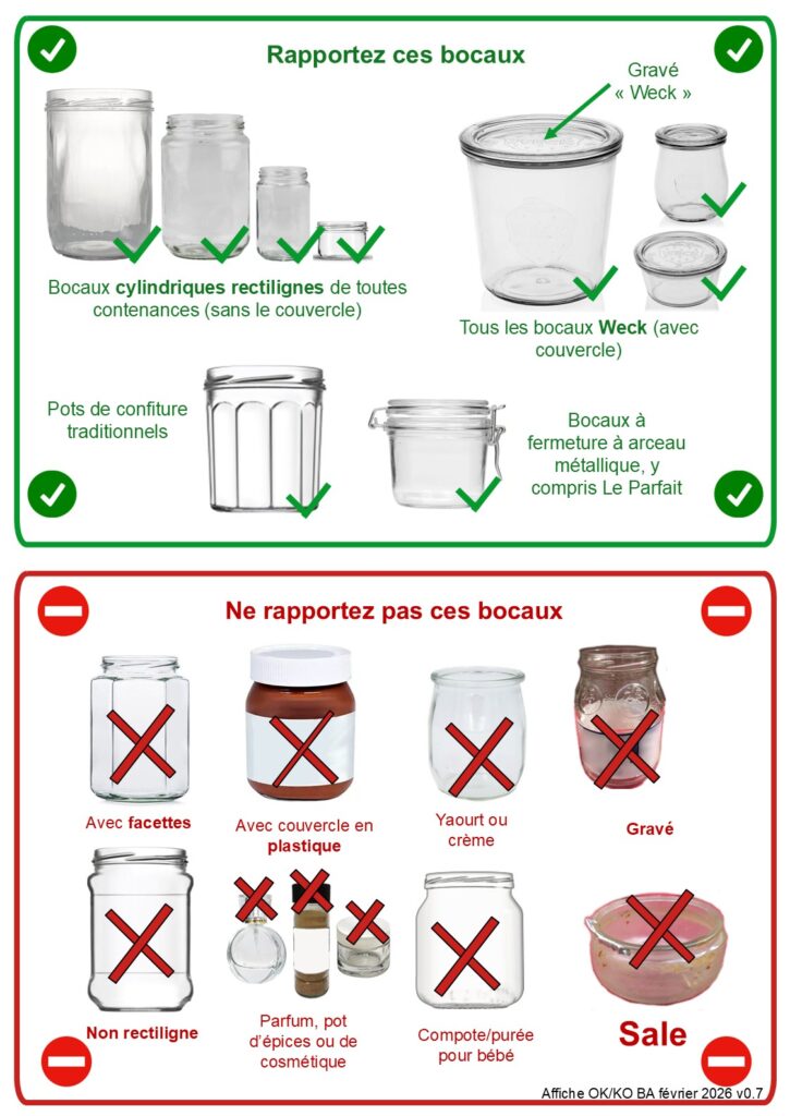 Nous NE reprenons PAS : les contenants ébréchés ou sales, les bouteilles et pots à goulot étroit sans symbole de réemploi : par exemple vin, cidre, limonade, huile, vinaigre, parfum… Les bouteilles et bocaux non rectilignes, non cylindriques, les bocaux avec des rainures, des facettes, des aplats, des gravures… les pots de yaourt sans pas de vis, les contenants sales.